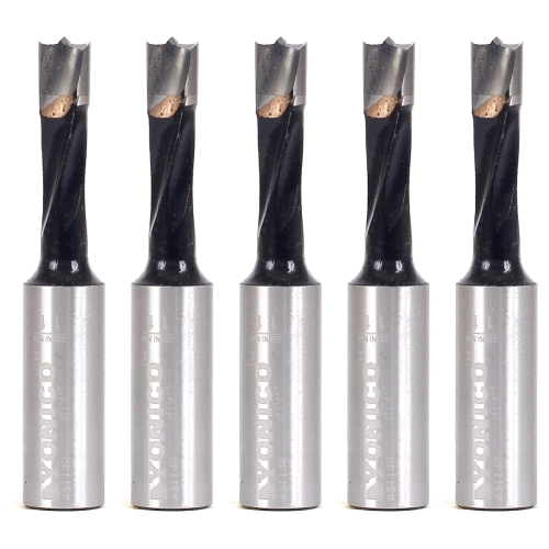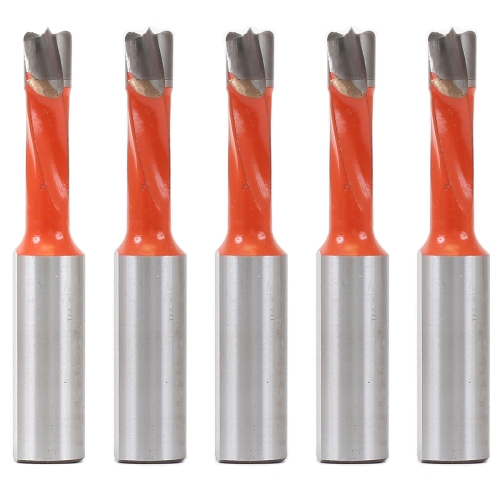 Carbide tipped brad point boring bits are designed to drill clean blind dowel holes. The smooth non-stick coating helps the wood chips slide up the bit and out of the hole while drilling. 10mm shank with driving flat and length adjusting screw.
