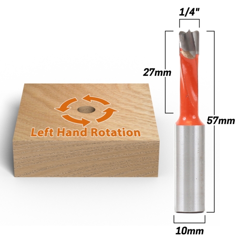 This left handed brad point boring bit has a 1/4" diameter and a 27mm cutting depth. The shank is 10mm in diameter with a 20mm length. The shank also has a driving flat and a length adjustment screw.
