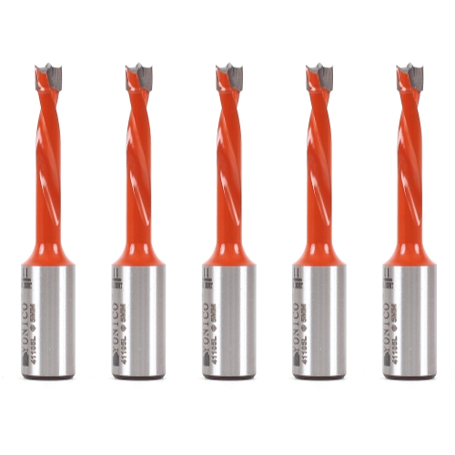 Carbide tipped brad point boring bits are designed to drill clean blind dowel holes. The smooth non-stick coating helps the wood chips slide up the bit and out of the hole while drilling. 10mm shank with driving flat and length adjusting screw.