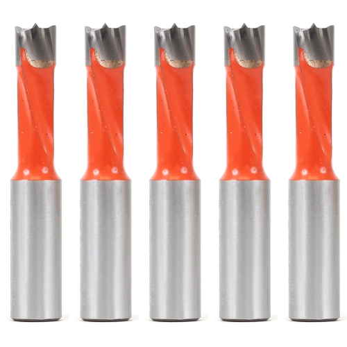 Carbide tipped brad point boring bits are designed to drill clean blind dowel holes. The smooth non-stick coating helps the wood chips slide up the bit and out of the hole while drilling. 10mm shank with driving flat and length adjusting screw.